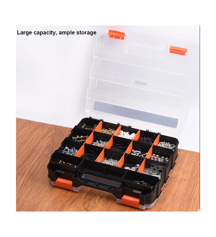 Boîte de rangement en plastique double face pour petites pièces et composants.